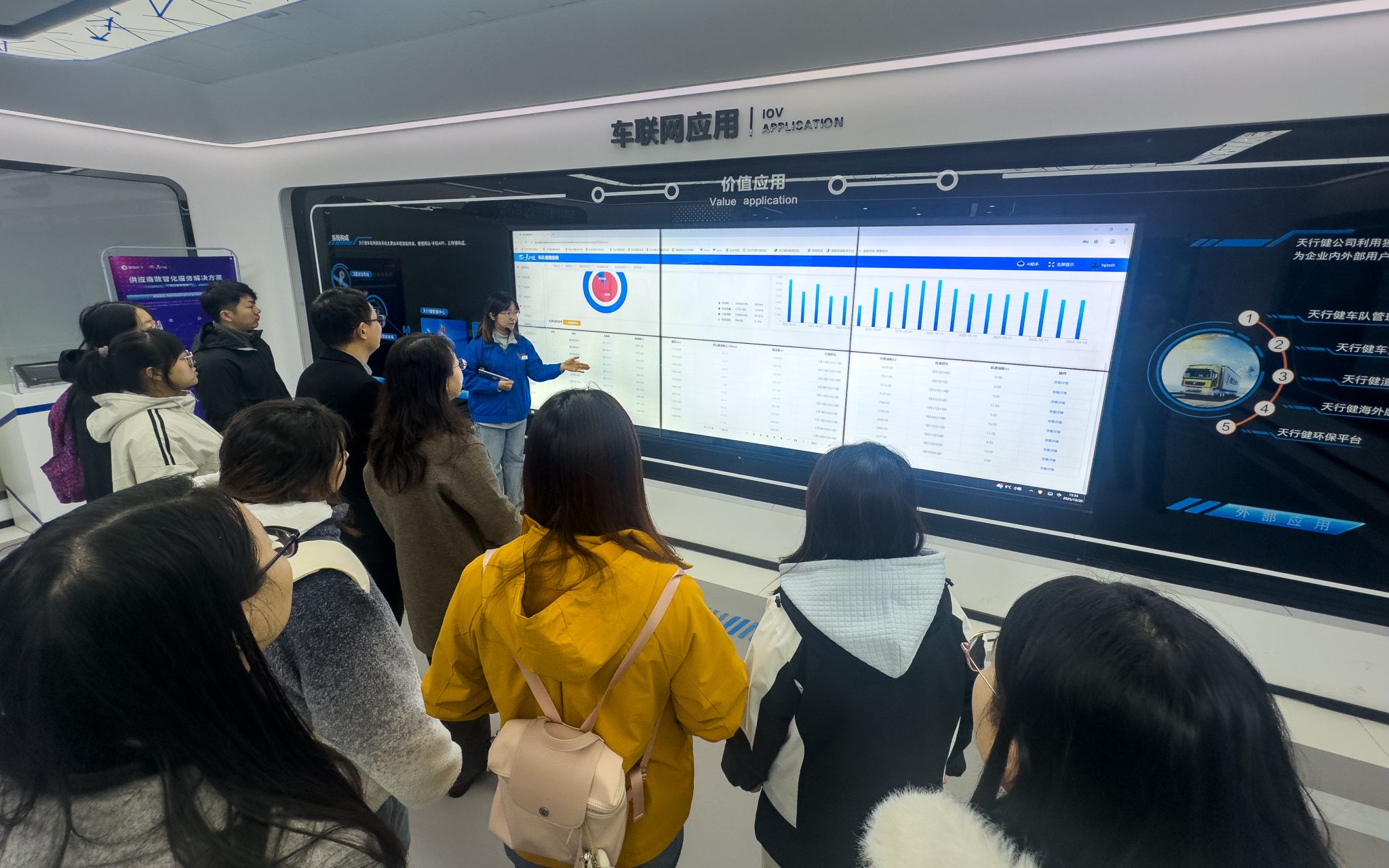 总装车间参观结束后,师生一行来到天行健车联网体验中心,观看了天行健车联网系统如何利用毫秒级数据采集与AI分析构建车辆“数字孪生”模型,覆盖工况监测、驾驶行为识别、油耗优化及故障预测等功能,直观呈现了车联网对智能交通的支撑作用。此次沉浸式体验,让学生们对智能制造和智慧交通有了更为立体的认知,感受到中国在全球汽车产业中不断攀升的科技实力与创新能力。