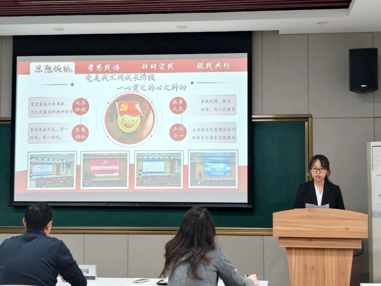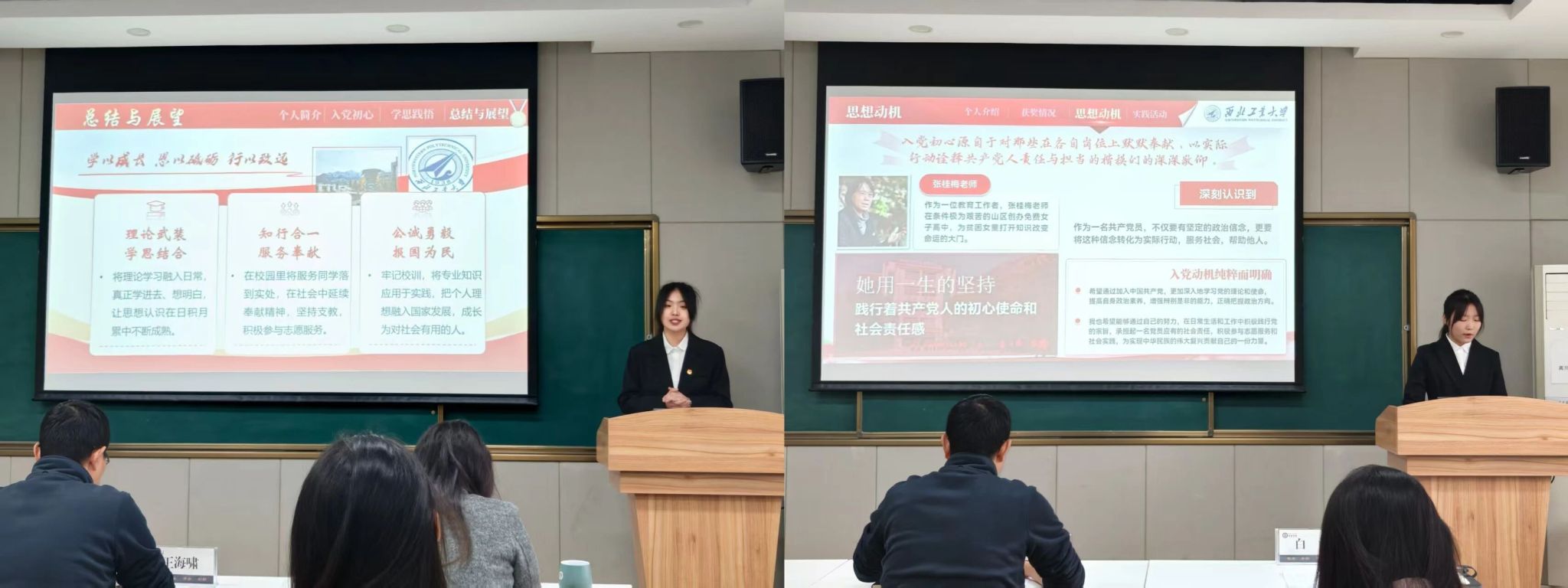 答辩环节中,50名入党积极分子依次上台,围绕入党动机、对党的认识、个人成长经历等内容进行系统陈述,并全面展示了在校期间在专业学习、科研竞赛、志愿服务及学生工作等方面所取得的成果,充分彰显了同学们坚定的政治追求、扎实的综合素质以及积极向党组织靠拢的自觉意识。
