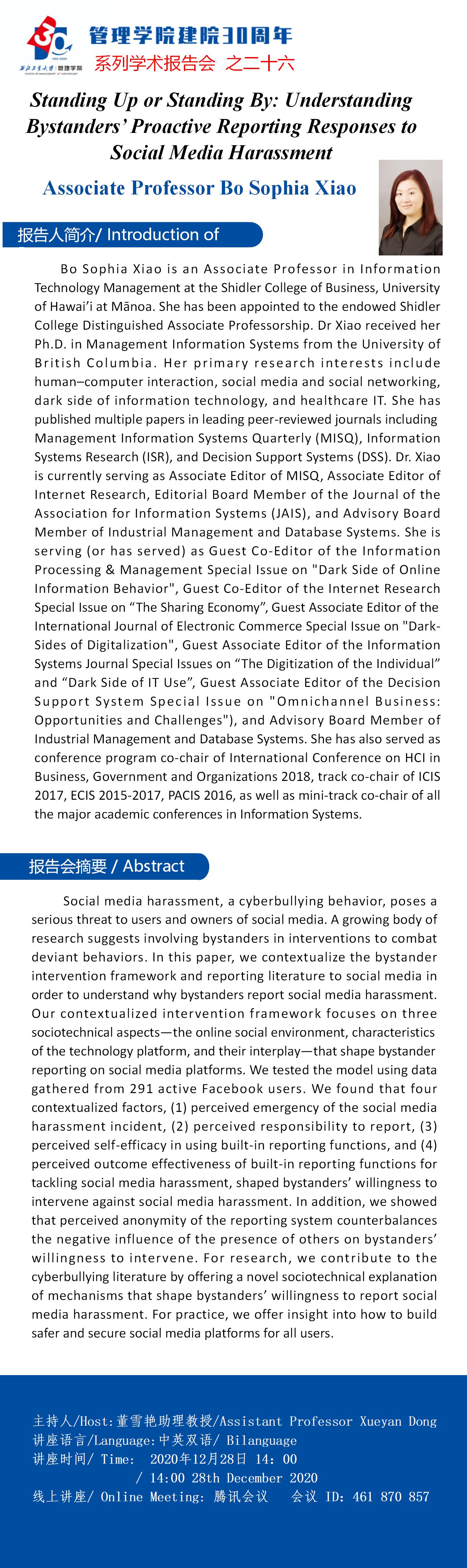【2003网站太阳集团建院30周年系列学术报告会之二十六】Standing Up or Standing By: Understanding Bystanders’ Proactive Reporting Responses to Social Media Harassment