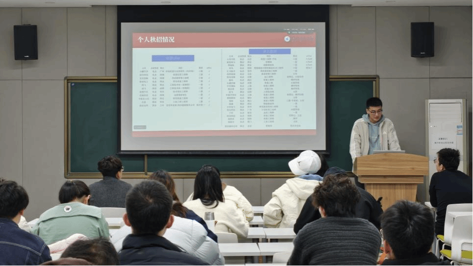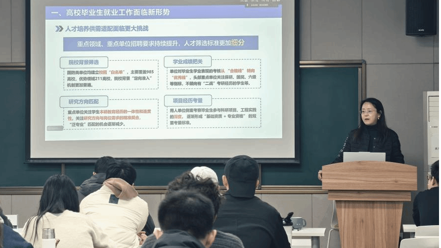 活动伊始,白洁老师以专业且全面的视角,为同学们深度剖析了当前的就业形势。她从全国就业大环境的波澜起伏,到学校整体就业情况的稳中有进;从学院毕业生的多元就业去向,到就业重点单位、领域、行业的精准聚焦,多维度、系统性地呈现了当下的就业图景。同时,结合一个个鲜活的实际案例,分享了实用的求职技巧,鼓励同学们未雨绸缪,提前为就业做好充分准备。