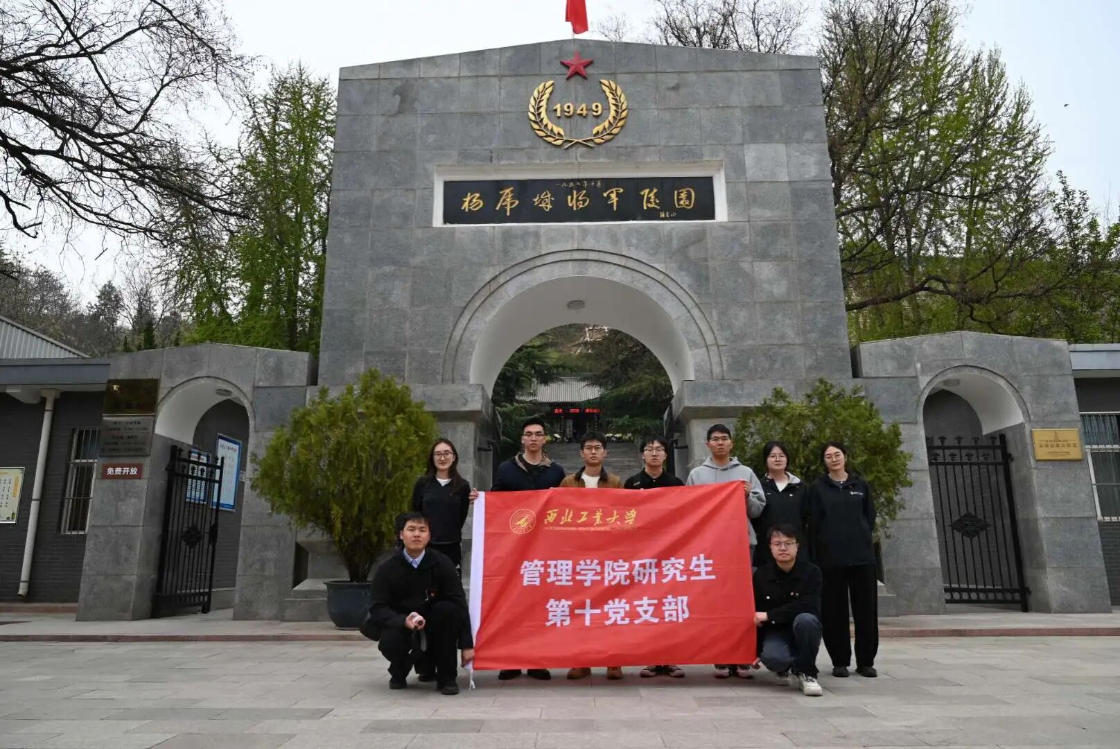 陵园内草木肃立,氛围庄重肃穆。在工作人员的细致讲解下,党员们全面了解了杨虎城将军的革命一生——从“二虎守长安”的浴血坚守,到发起西安事变的历史担当和为民族存亡挺身而出的壮举,令在场党员深受震撼。在将军墓前,全体党员肃立默哀一分钟,党员代表手捧素菊缓步敬献碑前,以鲜花寄哀思,以躬身表敬仰。随后,大家高举右拳,庄严重温入党誓词,铿锵誓言在陵园中回荡。仪式结束后,党员们参观了杨虎城将军革命纪念馆与影像馆,通过珍贵文物、文献与短片等鲜活资料,重温峥嵘岁月。