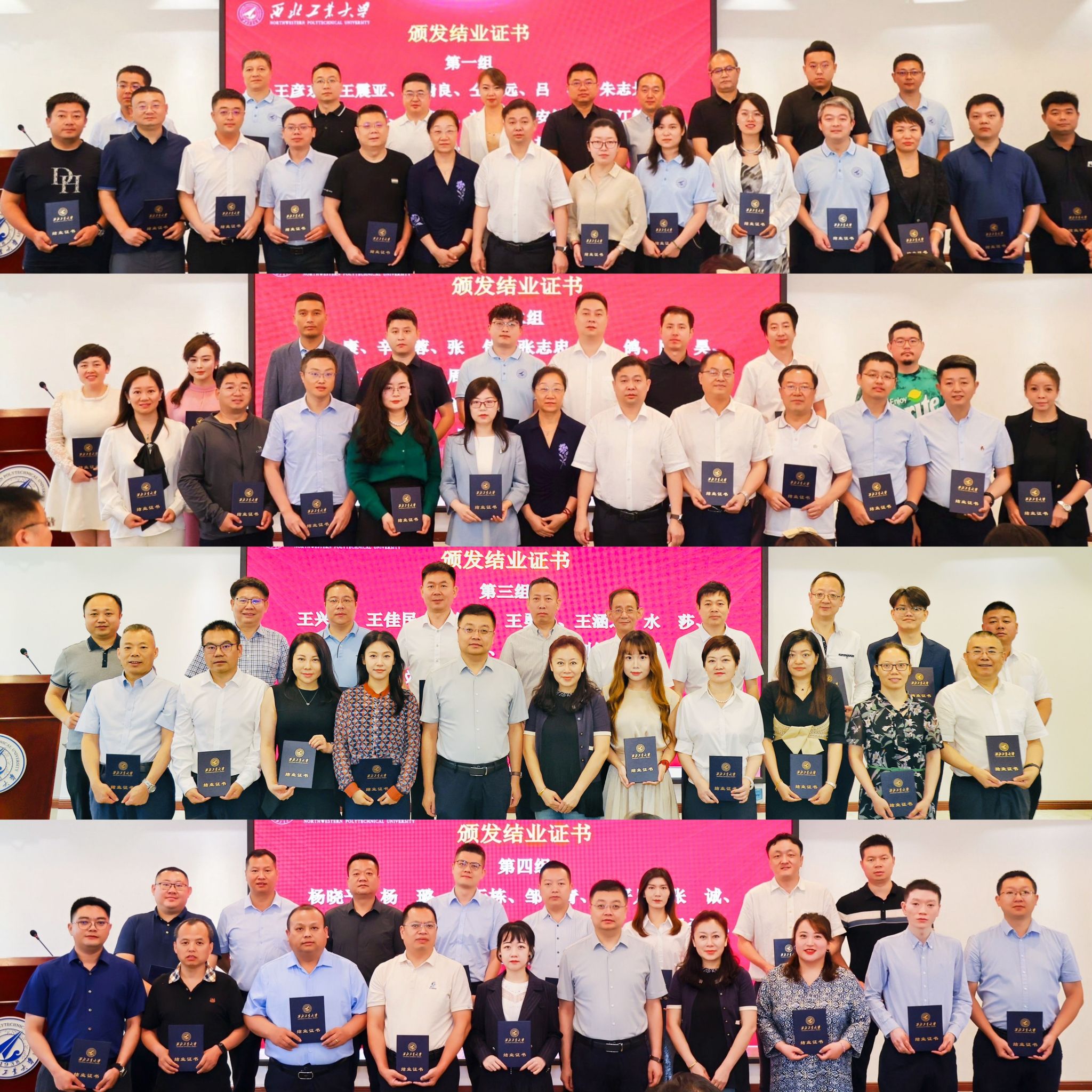 在两个班结业回顾短片后,省工信厅产业链推进处兼运行监测处张勇处长、中小企业服务处豆宁处长,非公经济发展处黄克强二级调研员,中小企业人才服务中心李卫科副主任,西工大2003网站太阳集团张爽书记,对外联络办公室徐伟侠副主任为结业学员颁发结业证书和荣誉奖牌。希望结业学员们发挥传帮带作用,继续为西工大企业家培育平台建设添砖加瓦。
