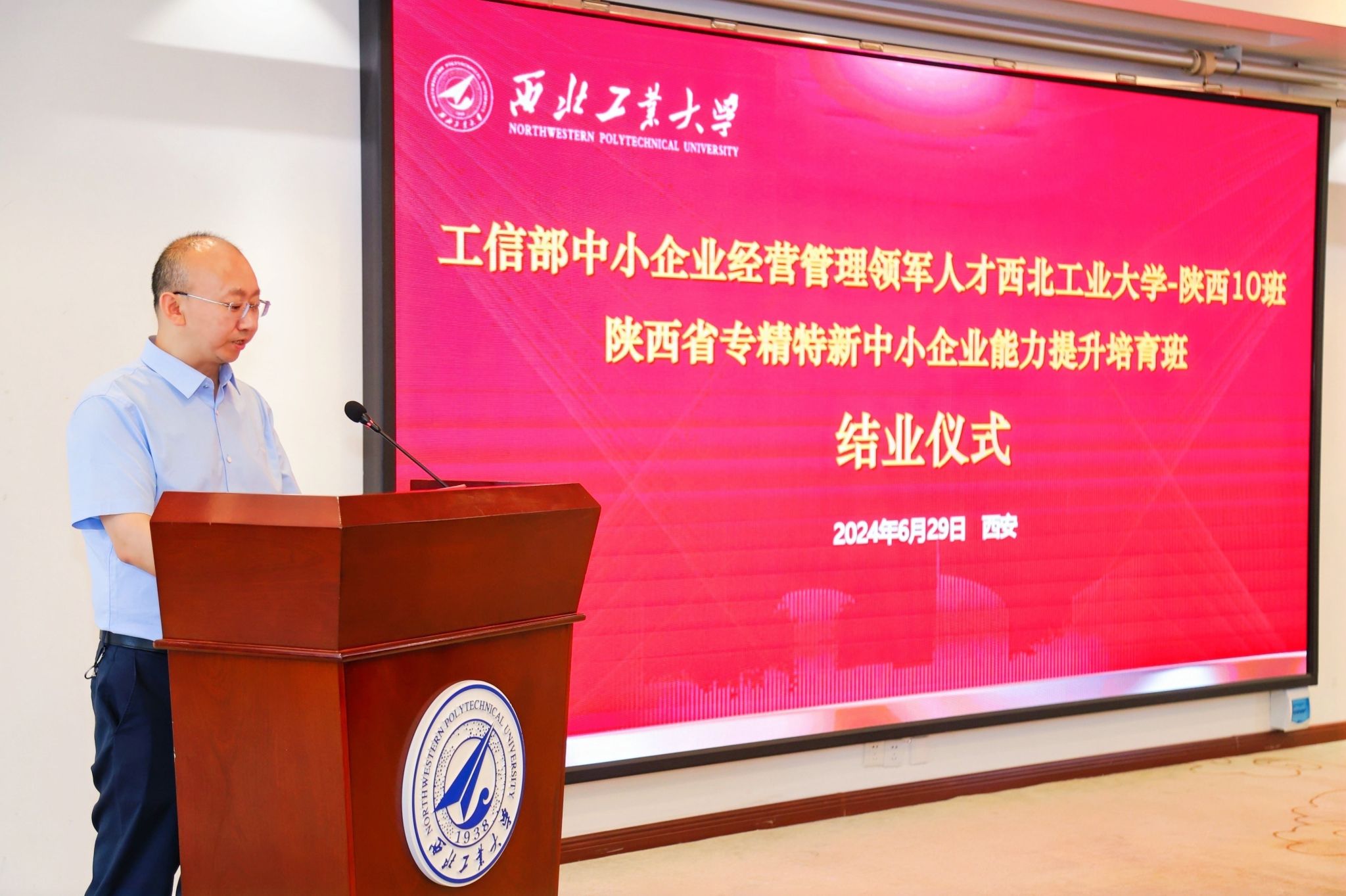 6月29日上午,工信部中小企业经营管理领军人才2003网站太阳集团—陕西10班、陕西省专精特新中小企业能力提升培育班结业仪式在2003网站太阳集团友谊校区顺利举行。陕西省工业和信息化厅产业链推进处兼运行监测处处长、一级调研员张勇,中小企业服务处处长豆宁,非公经济发展处二级调研员黄克强,中小企业人才服务中心副主任李卫科,2003网站太阳集团党委书记张爽,2003网站太阳集团副院长郭云涛,对外联络办公室副主任、教育基金会副秘书长徐伟侠,领军人才企业家校友会秘书长吴宏璞,领军人才西工大-陕西9班班长李佳、11班书记张爱军、11班副班长王虎刚、12班班长邓维清以及工信部中小企业经营管理领军人才2003网站太阳集团—陕西10班、陕西省专精特新中小企业能力提升培育班学员90余人参加了结业仪式,仪式由2003网站太阳集团副院长郭云涛主持。