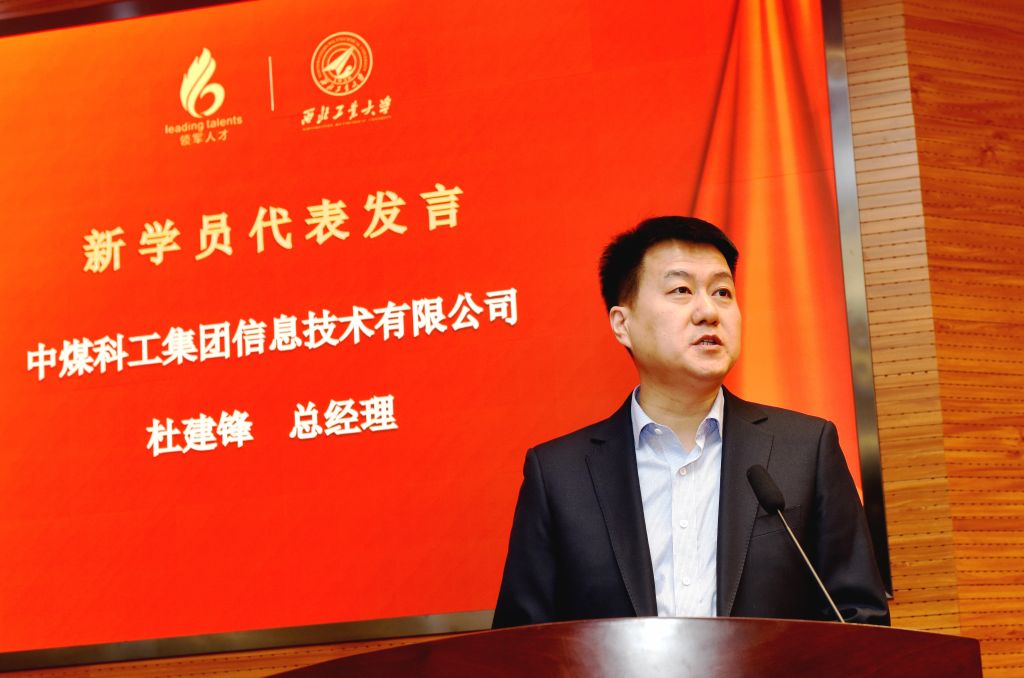 新学员代表中煤科工集团信息技术有限公司总经理杜建锋发言,他表示与陕西省的企业精英们汇集一堂,共同学习思考,相互交流启发,必将对今后的工作推进产生深远影响,也必将在助力陕西省新时代追赶超越新篇章的进程中,发挥新的引领示范和辐射带动作用。并代表新学员表态,在今后学习中,一是在学深悟透上下功夫,在以学促行上抓实践;二是在遵守纪律上严要求,在服从管理上讲自觉;三是在团结友爱中增友谊,在合作共赢中结硕果。