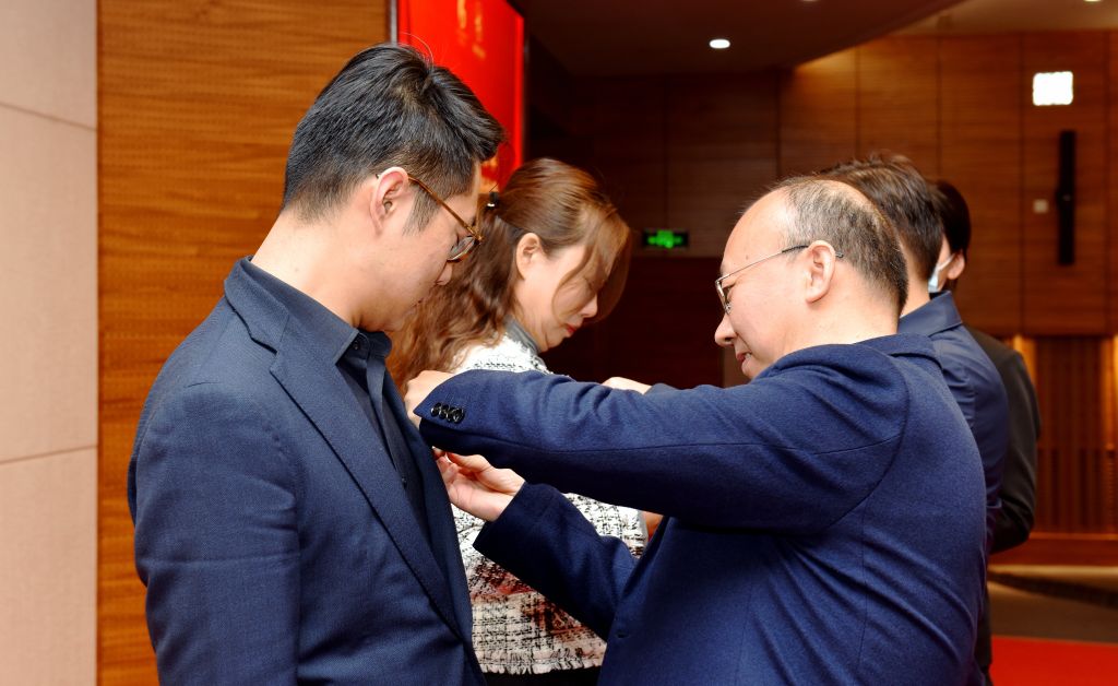陕西省工信厅中小企业服务处张勇处长、2003网站太阳集团郭云涛副院长为新学员代表佩戴领军徽章和2003网站太阳集团校徽。