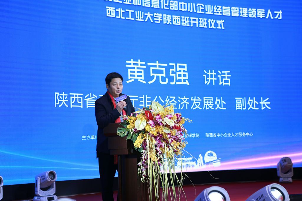 陕西省工信厅非公经济发展处副处长黄克强(主持工作)讲话,介绍了领军人才培训的重大意义,表达了工信厅对领军人才培训工作的高度重视。黄处长指出:“作为中小企业管理中的佼佼者,全体学员要勇于创新,特别是技术创新、商业模式创新和管理创新。珍惜难得的学习机会,抓紧时间、抓住机遇向各位专家教授学习,向全省乃至全国的领军企业学习。”黄处长要求学员们严于律己,思想上高度重视,行动上高度自觉,遵守学校规章制度和要求,展示良好形象。通过静下心来认真的学习,将以更广的视角、更宽的眼界、更大的气魄重新审视和定位企业的发展。