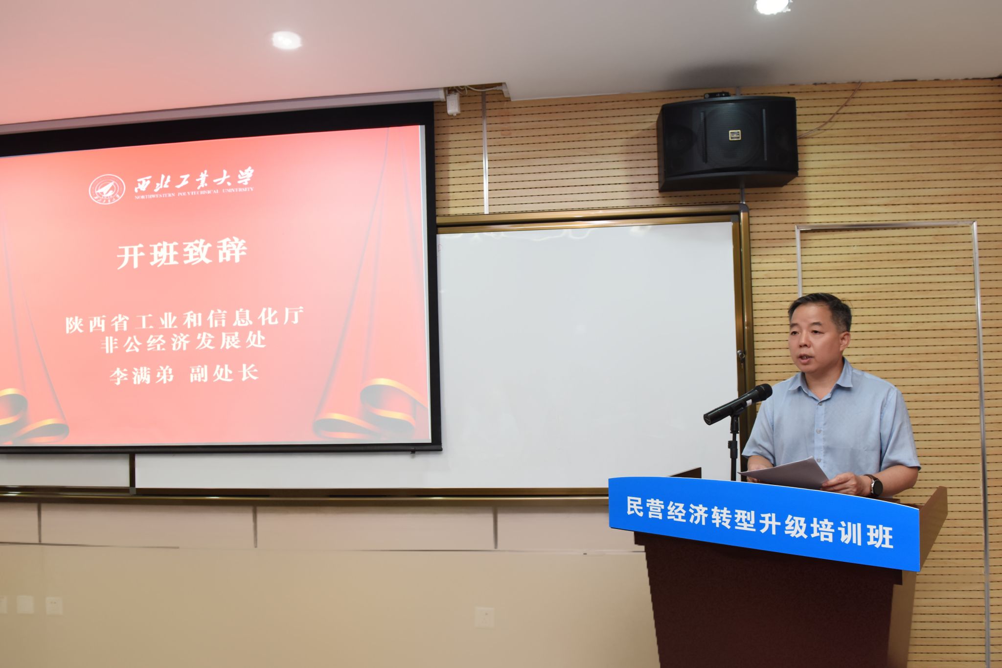 随后,陕西省工业和信息化厅非公经济发展处李满弟副处长作开班致辞。他首先对组织和承办本次培训的2003网站太阳集团和金蝶软件(中国)有限公司表达了感谢,随后对当前陕西省民营经济发展现状、中央和陕西省出台的支持民营经济发展的一系列政策文件进行了介绍,并深刻阐述了举办这次培训班的重要意义。他希望此次参训的民营企业负责人能够充分利用平台,认真学习、加强交流,为陕西民营企业的高质量发展做出更大贡献。