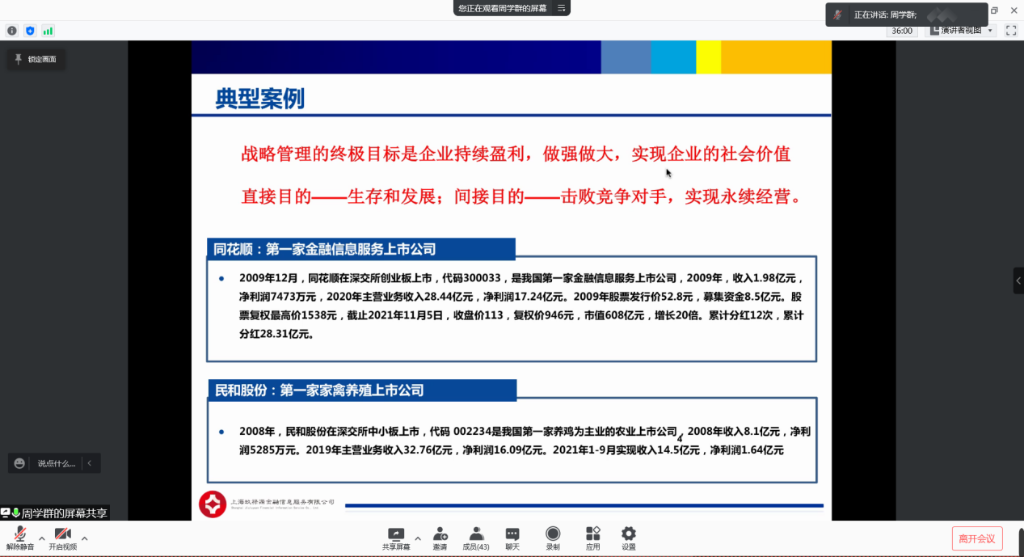 为了加深同学们对战略管理的理解,将理论学习与企业实践有效联系,11月7日下午,我院企业导师、MBA校友、上海玖禄源金融信息服务有限公司执行董事、总经理周学群先生走进课堂,为同学们呈现了《利用资本市场实现企业战略》的课程专题分享。