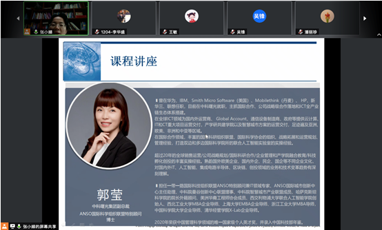 课程中张老师邀请我院企业导师、中科曙光集团副总裁郭莹女士进入课堂,做了《全球治理新时代的跨国企业管理》的课程主题分享。郭莹女士结合自己丰富的跨国企业工作经历,以全球宏观形势与新经济、科技创新与新基建、科技成果的特征理解和转化之路、跨国公司的组织体系、跨国经营中的跨国文化管理、跨国经营中的法律法规风险管理等内容为主线,分享了她在国际合作领域的独特见解,并解答了同学们所关注的问题。郭莹女士精彩的职场经历,开放前瞻的国际合作素养和丰富的多文化沟通与交流经验,让同学们深受启发和激励。