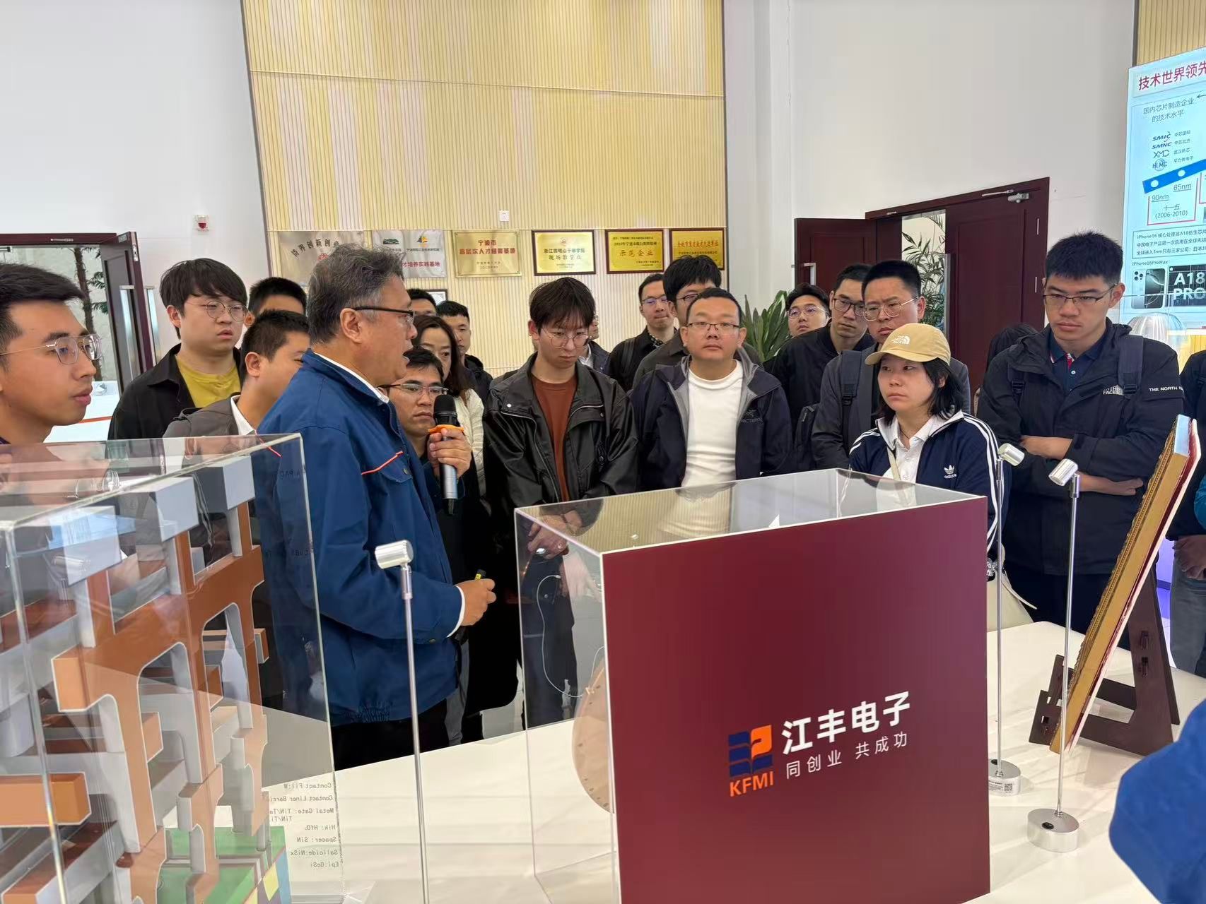 第二天,同学们奔赴余姚,走进宁波江丰电子材料股份有限公司,不仅近距离观察用于芯片制造的核心材料——超高纯金属溅射靶材,还聆听了其从研发到量产所经历的无数次尝试与突破。江丰电子的故事,是一堂生动的“卡脖子”技术攻坚课,也是一堂炽热的爱国主义教育课。