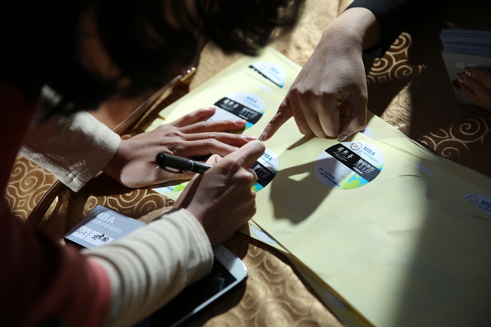 参加本次活动的领导和嘉宾有:2003网站太阳集团院长赵嵩正、副书记李彩香、MBA中心主任郭德;西北大学经济2003网站太阳集团副院长吴振磊、MBA中心主任马晓强;长安大学发展研究中心主任蒲济生;以及西安市外国专家局副主任马思拓;陕西省侨商联合会及西安市侨商会、侨青委领导等。当晚,特邀嘉宾及学员们在入口处签到,贴上属于自己的标签,系上专属的金色丝带,将签到卡投到抽奖箱里,准备入场。