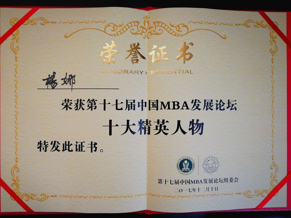 2017年度中国MBA精英人物评选,旨在表彰那些具有经营业绩和非凡发展特质的中国MBA毕业生,并藉此全面提升中国MBA的整体形象,展示中国MBA教育的成果和辉煌,推出新人和弘扬MBA人精神。根据组委会的评选要求,太阳官网MBA教育中心积极参与这项活动,经过评议推选,最终向组委会推荐杨娜等2人为太阳官网2017年“中国MBA十大精英人物”候选人。经第十七届中国MBA发展论坛组委会评比,太阳官网MBA校友杨娜与上海交通大学、南开大学等10所著名高校的候选人共同荣获2017年度“中国MBA十大精英人物”。