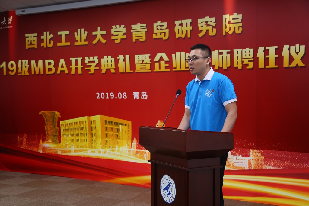 随后,由四位导师为新生代表佩戴校徽并授予班旗。2019级MBA新生代表徐加生,代表全体新生进行发言,他表示:我们来自五湖四海,但初心一致,希望在以后的学习生活中,不仅能够收获知识,收获友谊,更能一起碰撞出创新的火花,彼此帮扶,锐意进取。