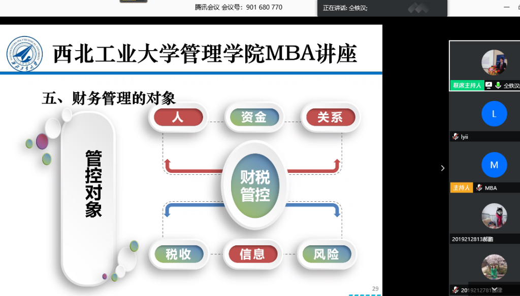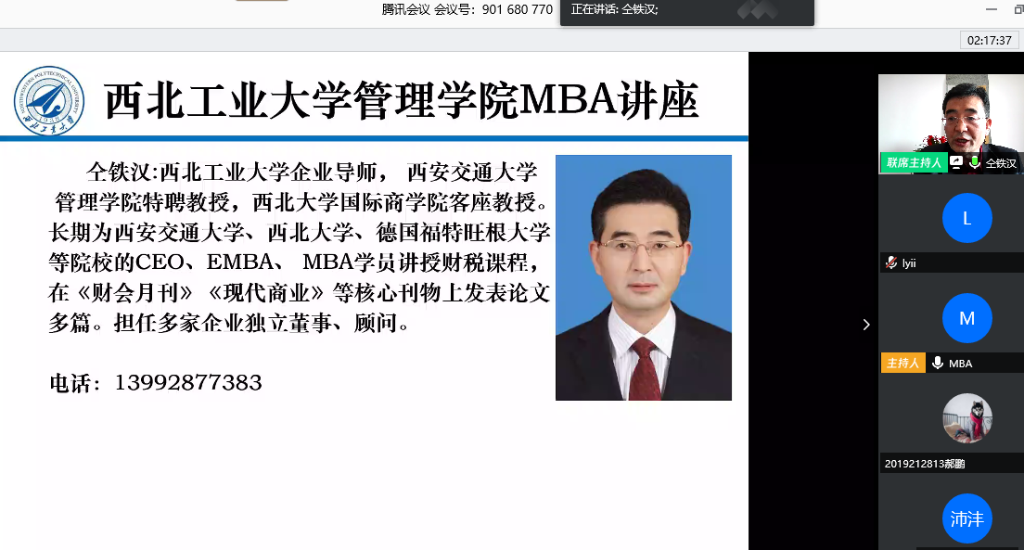 4月19日上午,我院特邀企业导师仝铁汉教授带来首场“云上讲座”---《疫情防控时期企业财务管控方略》,讲座通过腾讯会议平台直播,由陈琳教授主持,2019级专业学位研究生MBA、MEM、MPAcc共计226人线上聆听了讲座。