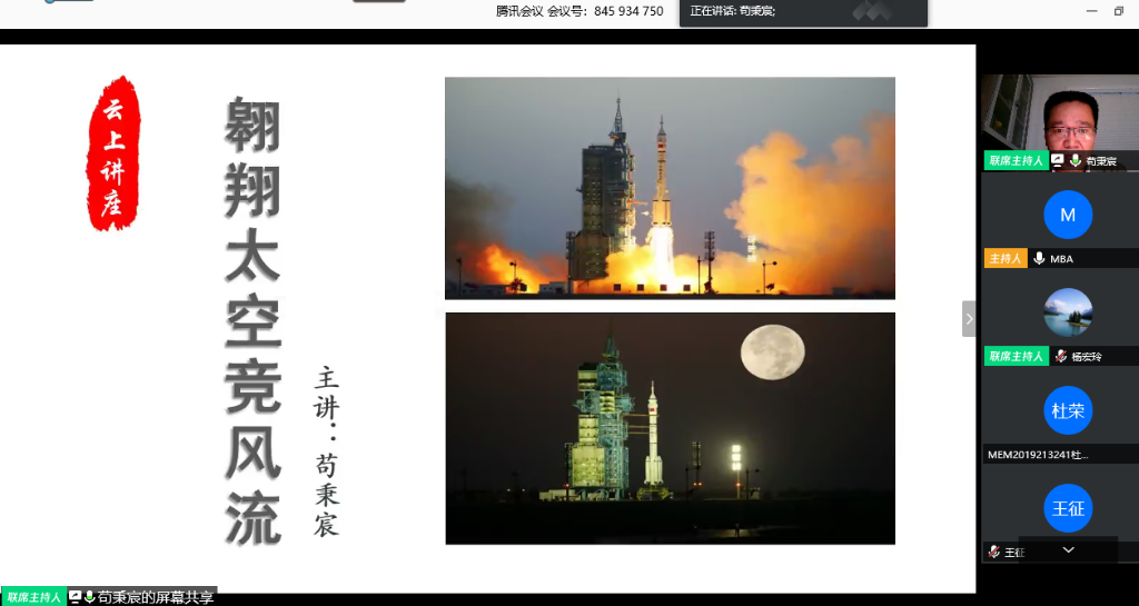 5月15日晚,太阳官网机电学院苟秉宸教授受邀为我院专业学位研究生做了《翱翔太空竞风流---中国载人航天事业的亲历与思考》专题讲座。讲座由MBA/MEM教育中心主任杨宏玲主持,百余名学生通过腾讯会议软件在线聆听了讲座。