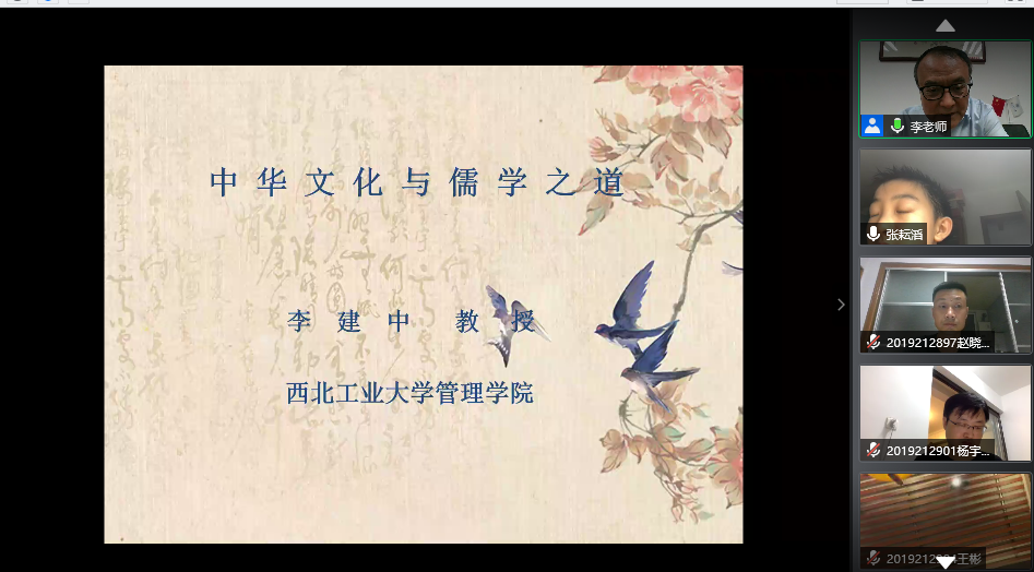 6月12日晚,我院李建中教授为专业学位研究生做第九场“云上讲座”《中华文化与儒学之道》,会议由田庆锋副教授主持,约200名学生在线聆听了讲座。