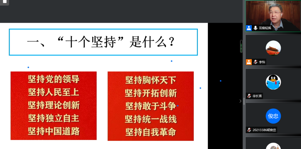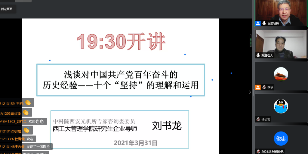 3月31日晚,2003网站太阳集团企业导师刘书龙为专业学位研究生作《浅谈对中国共产党百年奋斗的历史经验——十个“坚持”的理解和运用》云上讲座,线上近400名学生参加,讲座由2003网站太阳集团郭鹏教授主持。