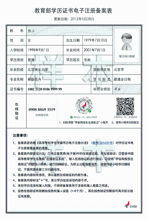 教育部学历证书电子注册备案表或中国高等教育学历认证报告样本