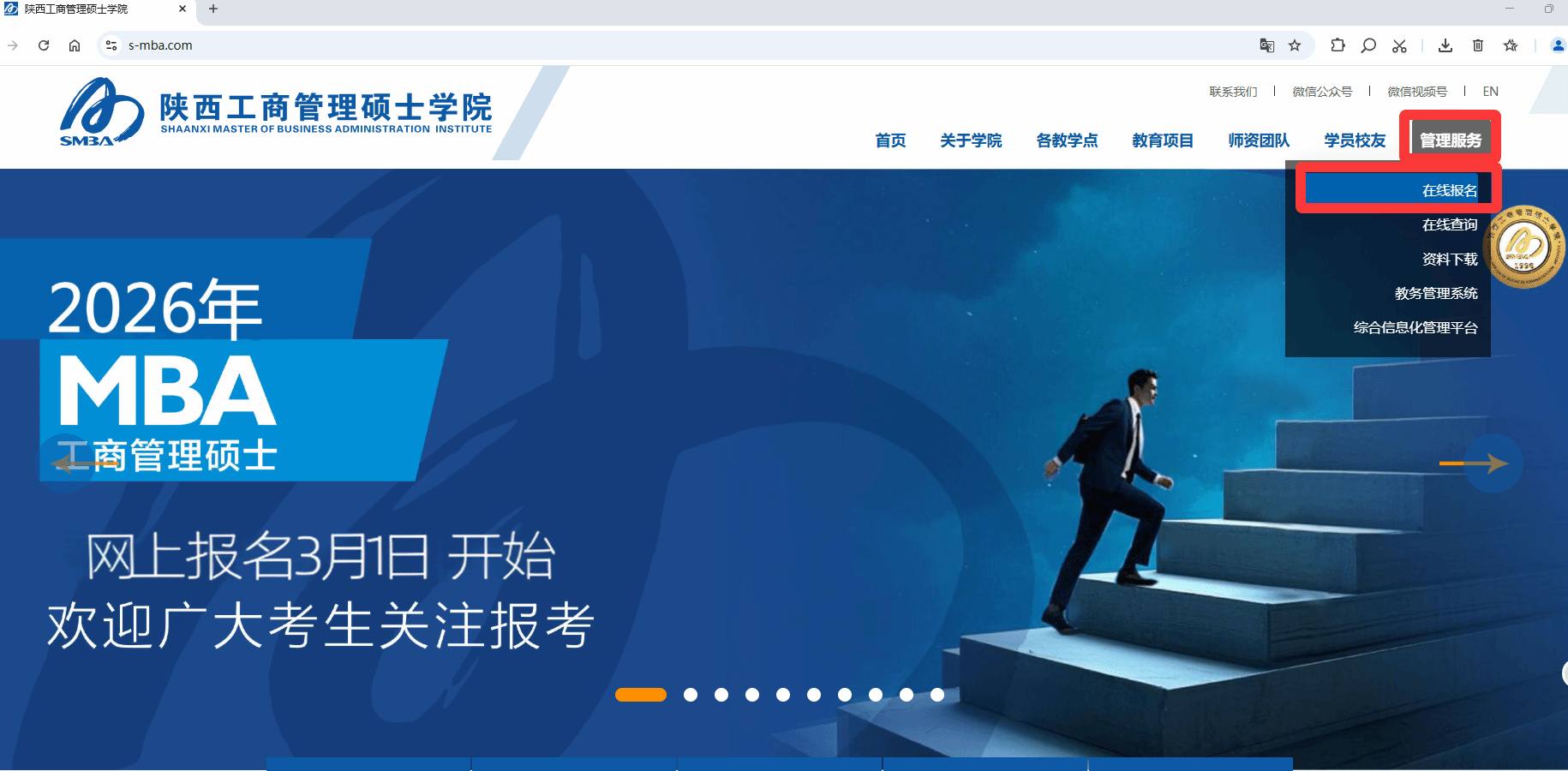 电脑、手机浏览器登录http://www.s-mba.com/,点击【管理服务】--【在线报名】