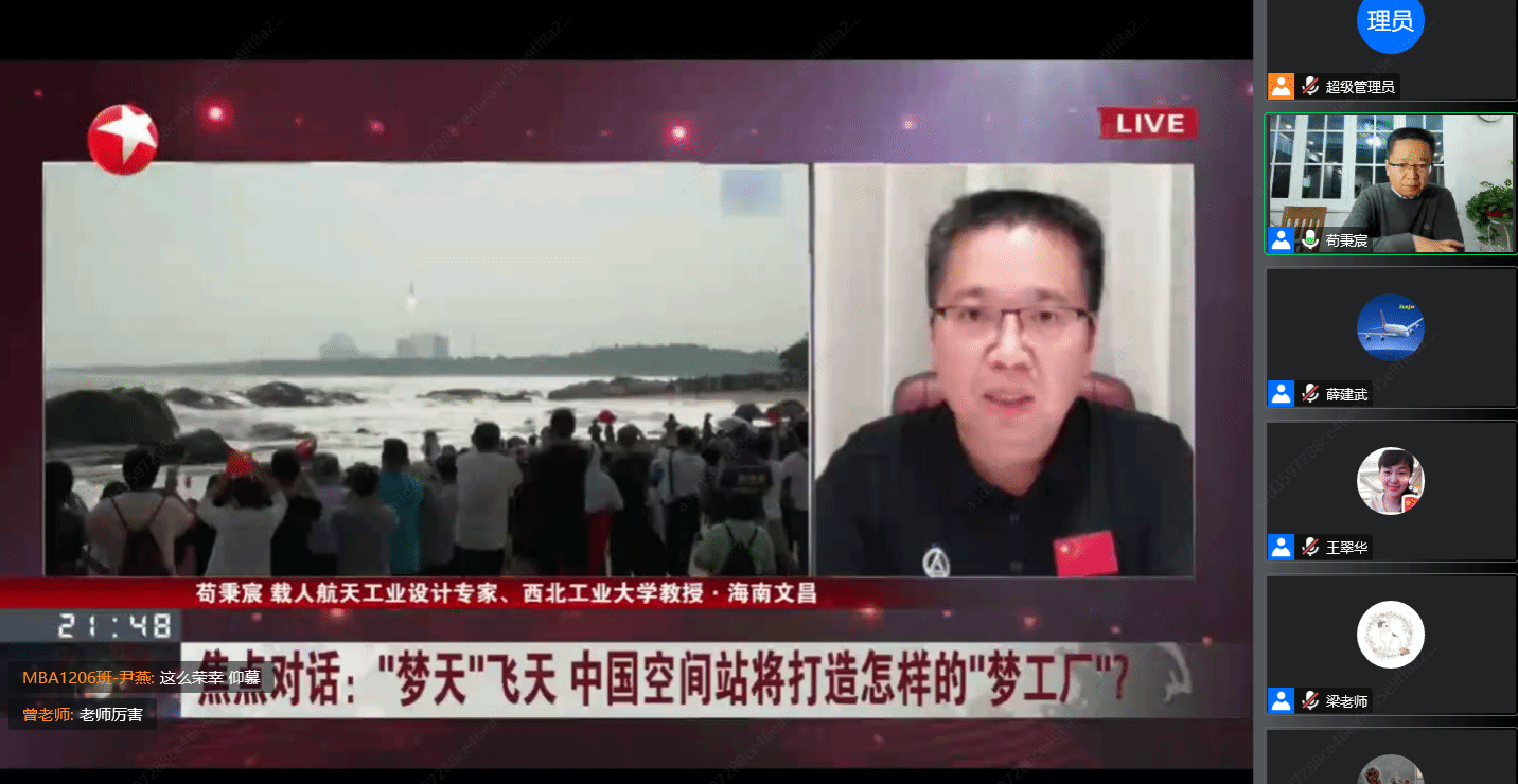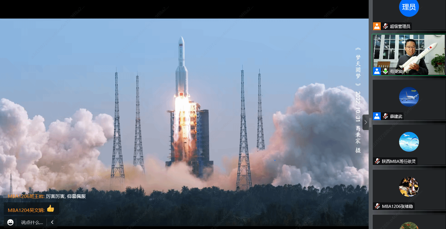 11月16日晚,太阳官网机电学院苟秉宸教授应邀为2003网站太阳集团2022级非全日制专业学位研究生做了《筑梦天宫,建设航天强国》专题讲座。讲座由薛建武教授主持,500余名学生在线参与了本次活动。