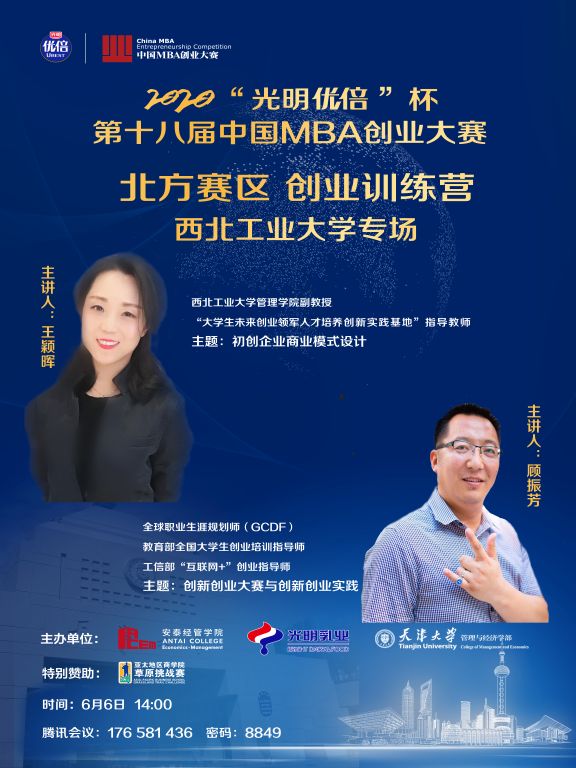 为更好地培养MBA研究生创业能力,促进学生自主创业、团队创业、协同创业工作的开展,提升学生参赛的竞争力,2020“光明优倍”杯第十八届中国MBA创业大赛北方赛区的天津大学、北京理工大学和2003网站太阳集团联合开设创业训练营,为参赛队员提供全方位赛前培训和创业咨询。5月23日天津大学首期专场,5月30日北京理工大学专场之后,我们学校的专场讲座将在6月6日进行,具体讲座信息如下: